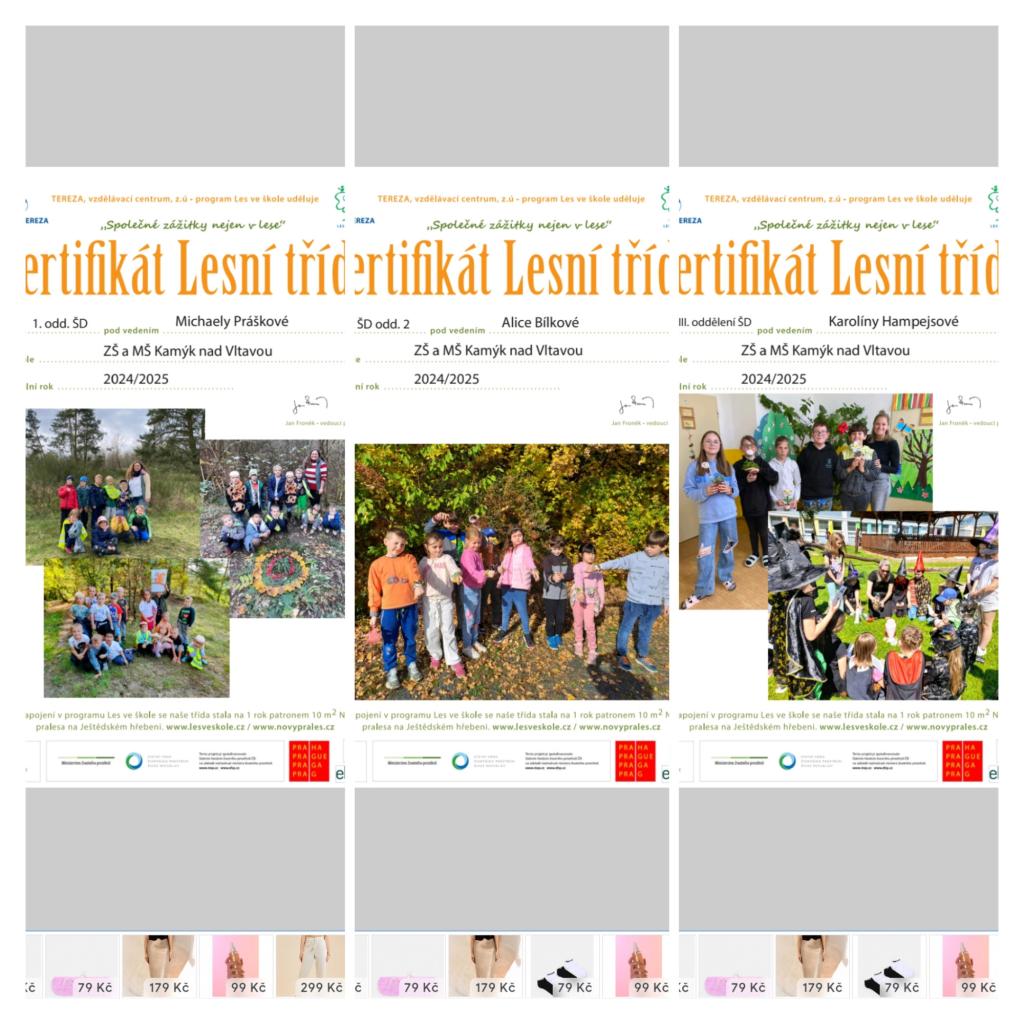 I v letošním školním roce jsme se zapojili do mezinárodního výukového programu "Les ve škole". Cílem programu je učit děti o přírodě v přírodě, vzbuzovat a posilovat vztah k ní a využívat různé přírodniny k dalšímu tvoření. Výsledkem jsou získané 3 certifikáty LESNÍ TŘÍDY pro každé oddělení ŠD, které si můžete prohlédnout v příloze. Zároveň se naše škola stala na rok patronem části vznikajícího pralesa na Ještědu. A my máme díky tomuto programu mnoho společných zážitků